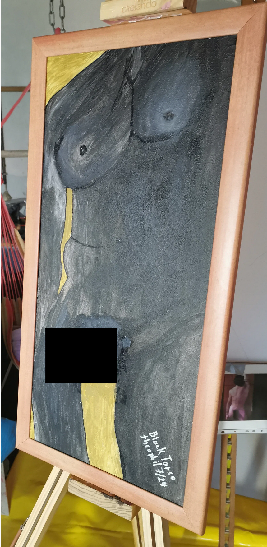 ...Ist ja eher ein Problem von Museen und Galerien. Doch plötzlich bin ich irgendwie auch betroffen. Und das kam so: Im Sommer 2024 malte ich das Bild "Black Torso" uns statte es mit einem Dildo der Firma Leneus aus. Dabei handelte es sich um eine Einzelanfertigung mit einer Eingegossenen Gewindestange, mit der ich Teil an der HDF Platte die als Malgrund diente, befestigen konnte.( Noch mal vielen Dank für diese tolle Arbeit an die Mitarbeiter der Firma Leneus.)